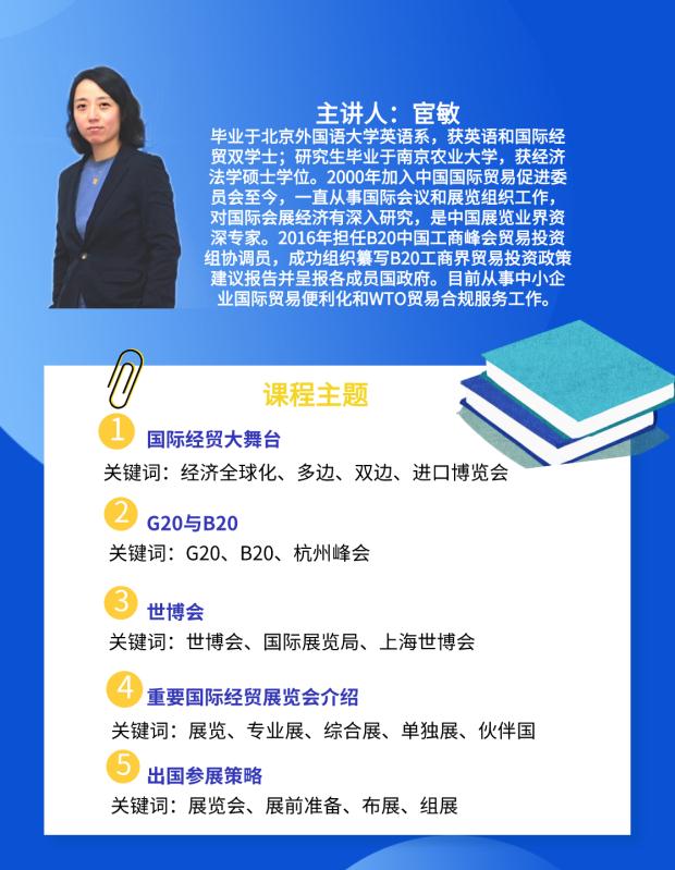 课程目的:能让更多中国企业,特别是中小企业在“走出去”国际化发展中用好国际经贸平台,寻找到更多的商机和合作伙伴。
